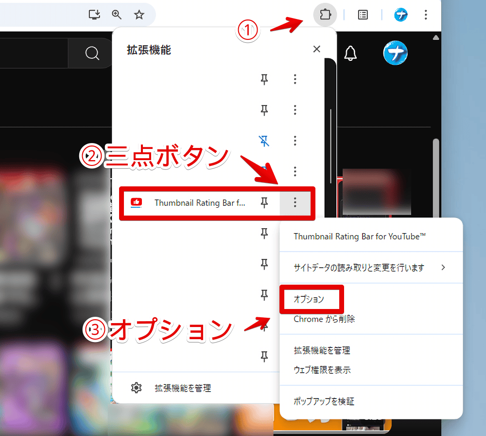 拡張機能のオーバーフローメニューを開いて、「Thumbnail Rating Bar for YouTube」拡張機能アイコンの三点ボタン→「オプション」をクリックします。