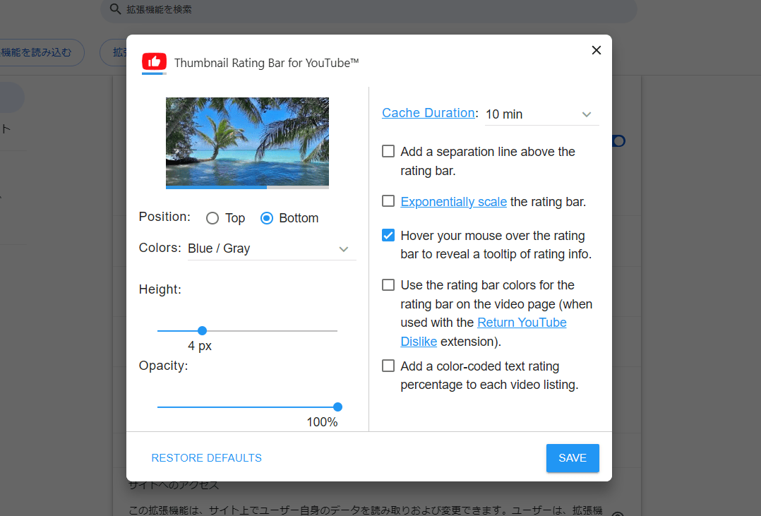 「Thumbnail Rating Bar for YouTube」拡張機能のオプション(設定)画像