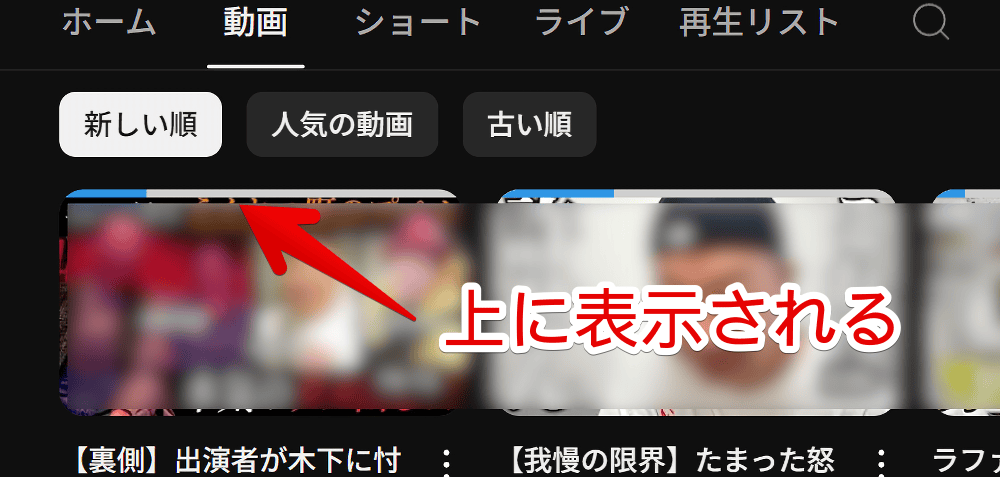 「Thumbnail Rating Bar for YouTube」拡張機能の低評価率バーを上に表示した画像