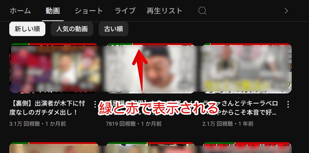「Thumbnail Rating Bar for YouTube」拡張機能の低評価率バーを緑と赤で表示した画像