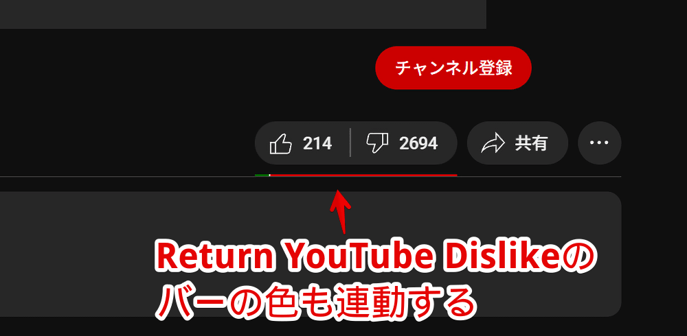 例えば、本拡張機能で「Green/Red」にした場合、「Return YouTube Dislike」側のバーも同じ緑色と赤色になります。