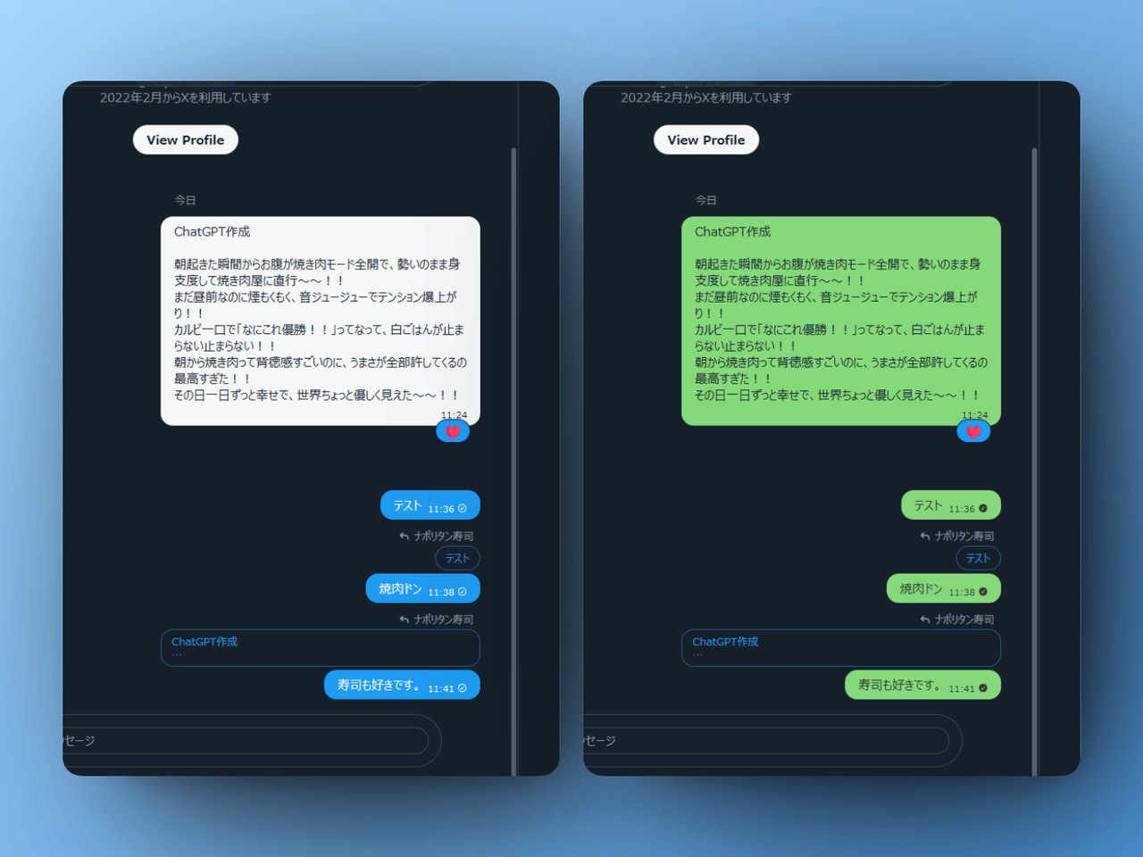 PC版X(旧Twitter)のチャット背景色を暗めの青とLINEの緑色にした比較画像