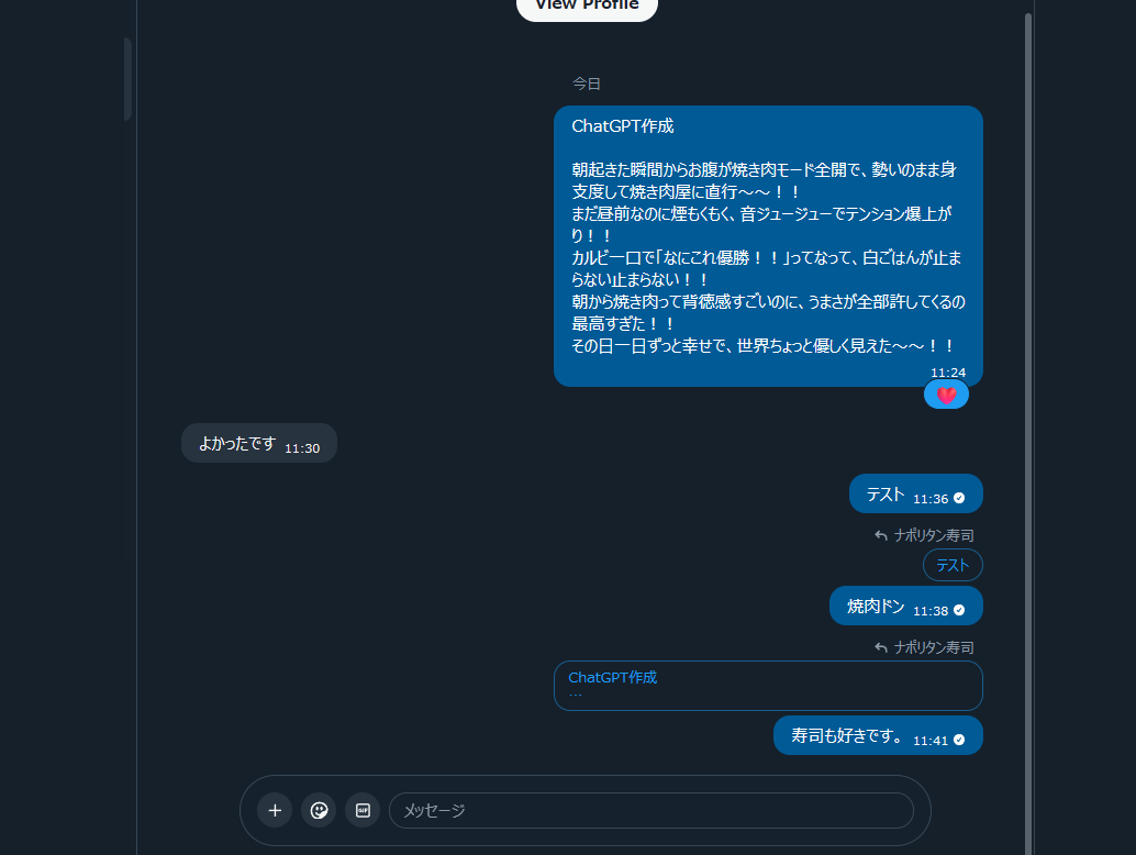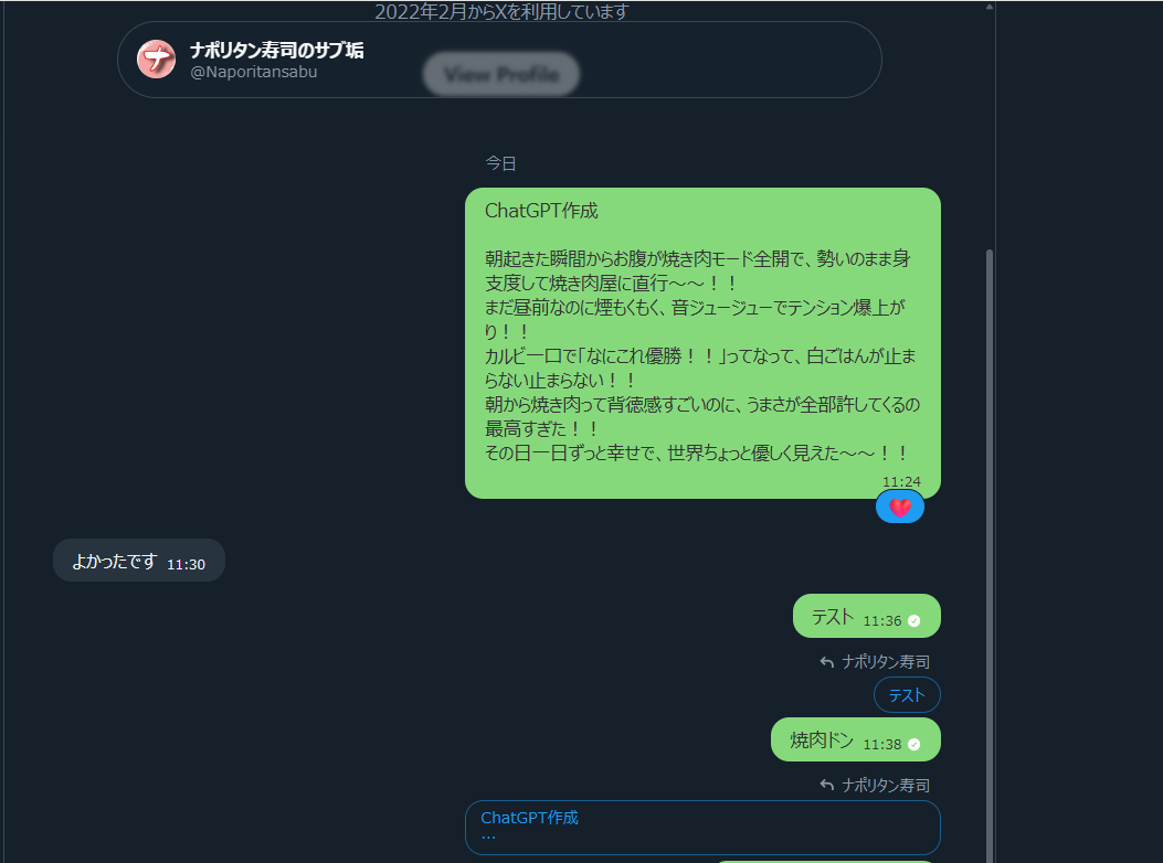 自分が送信したメッセージの背景色が変更されます。上記CSSだと暗めの青になり、文字色は白になります。Xの設定でどんな色(テーマ)にしている場合でも固定されます。