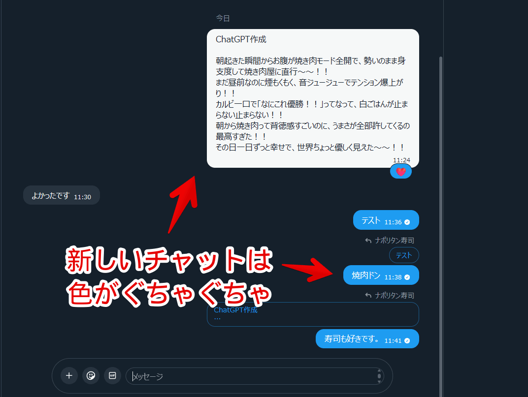 なぜか僕の環境だとPC版の背景色がおかしかったです。過去送信した自分のチャットの背景色は白で文字が黒なのに対して、最近送ったメッセージは青背景に白文字と統一性がないです。なぜかは不明です。