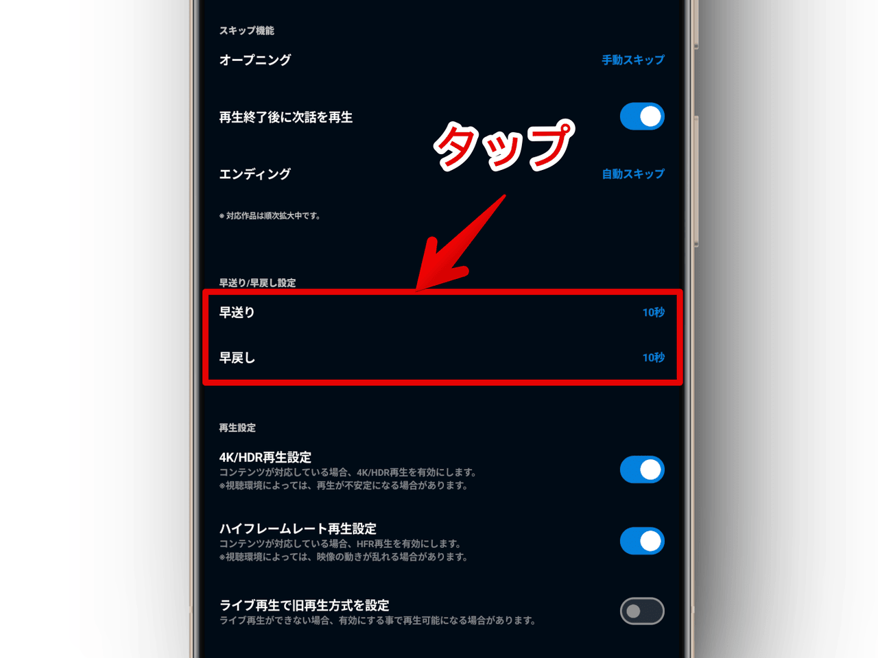 「早送り/早戻し設定」内にある「早送り」、「早戻し」をタップします。