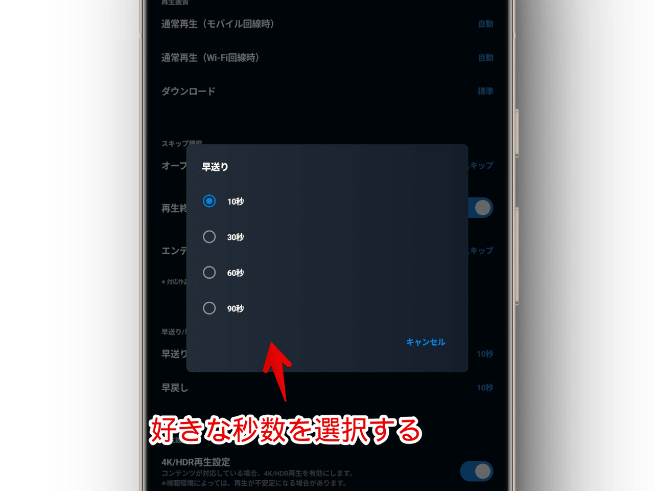 「10秒は少なすぎる!もっと一気にスキップさせたい!」って方のために、設定でより多くの秒数が用意されています。