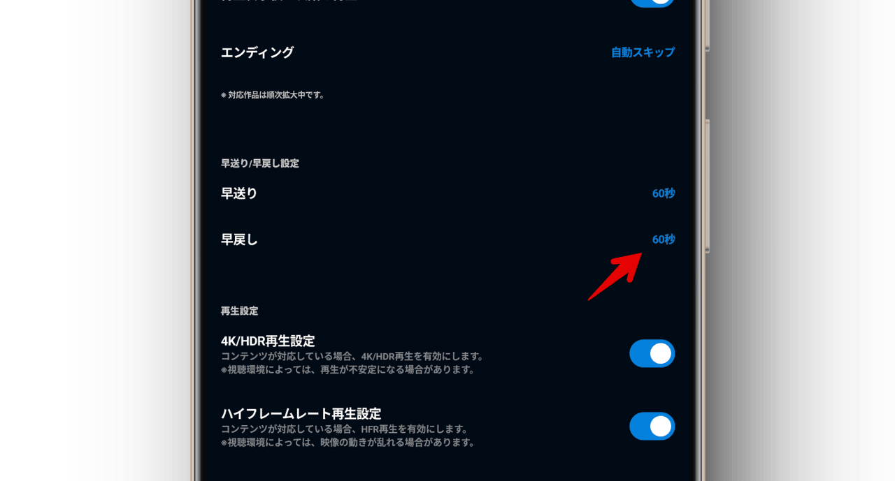 スマホアプリ版「U-NEXT」で早送り・早戻しの秒数を60秒にした画像