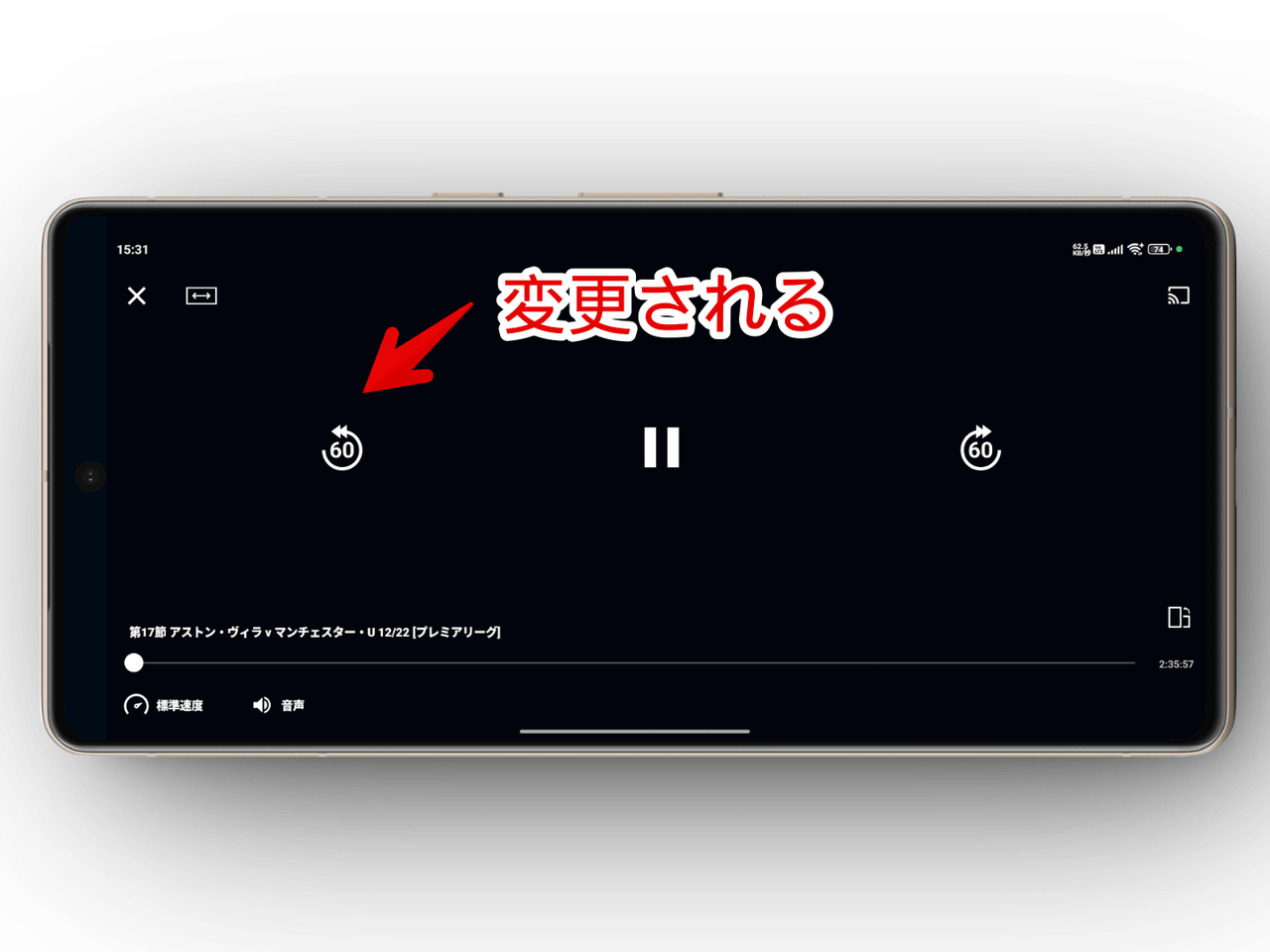 変更した後、適当に動画を再生します。画面上のオーバーレイボタンが「60」に切り替わっています。タップすると本当に60秒早戻し・早送りしてくれます。