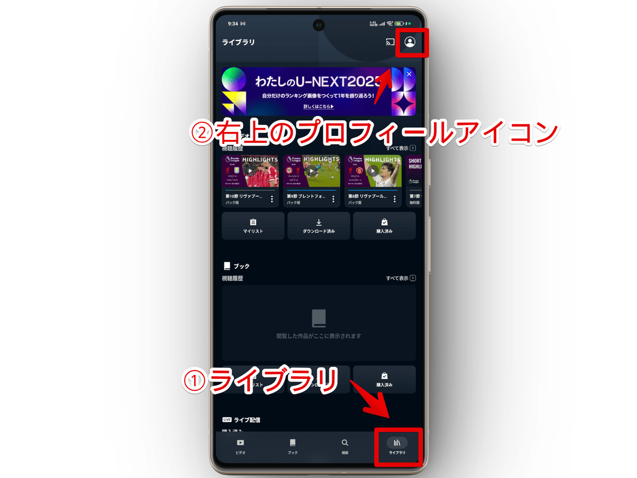 「U-NEXT」スマホアプリを起動して、右下の「ライブラリ」→右上のプロフィールアイコンをタップします。