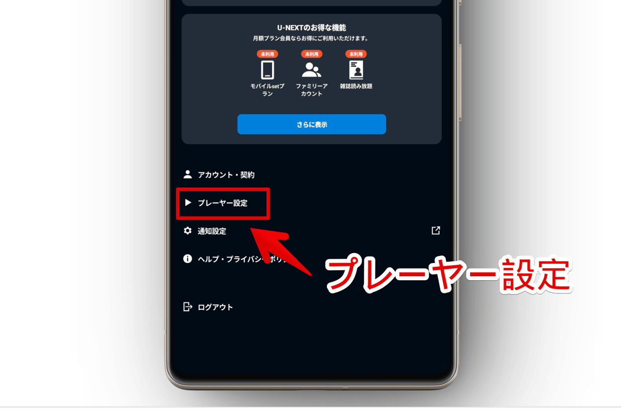スマホアプリ版「U-NEXT」で「プレーヤー設定」を開く手順画像