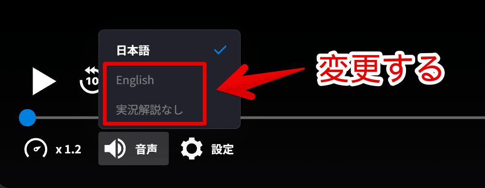 デフォルトでは「日本語」が選択されています。英語にしたい場合「English」、現地音声のみ聞きたい場合は「実況解説なし」にします。