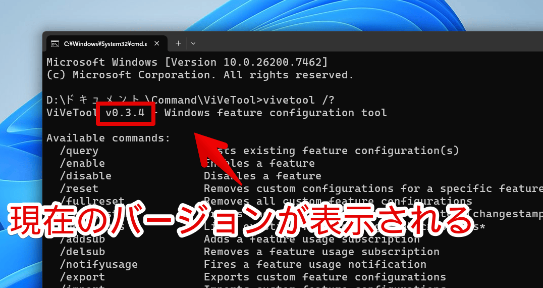【ViVeTool】現在のバージョンを確認する方法。「vivetool /?」だ!