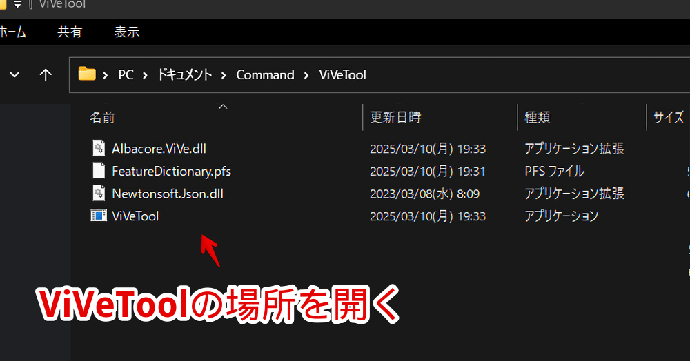 Windows11で「ViVeTool」フォルダーを開いた画像