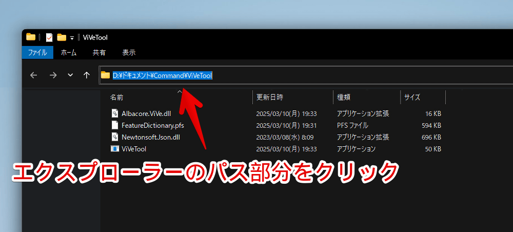 1. Windows11のエクスプローラーで「ViVeTool」の場所を開く