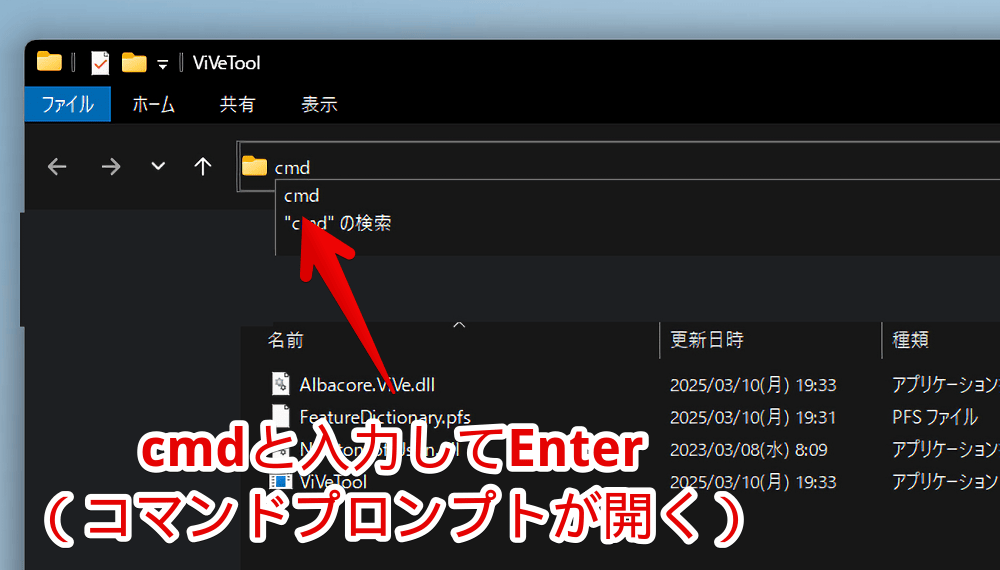 コマンドプロンプトで「ViVeTool」のパスに移動する手順画像