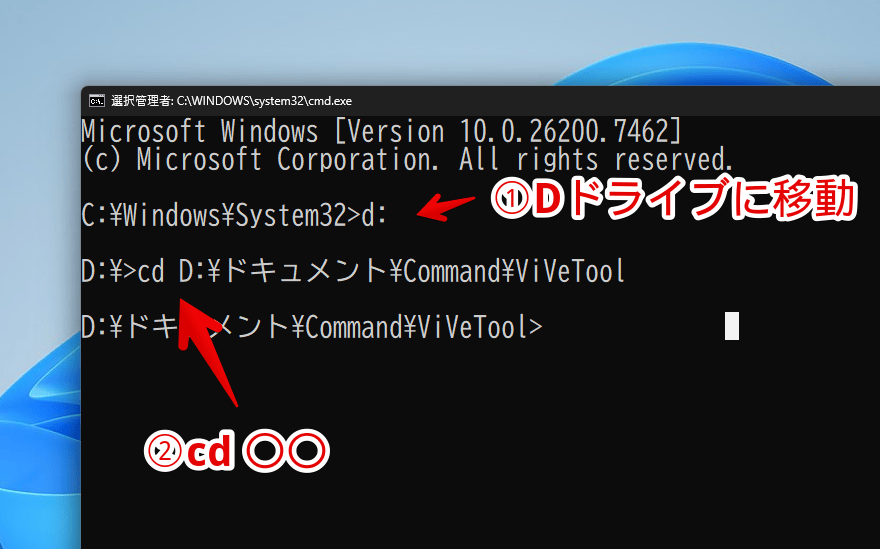 これでDドライブが選択されるので、次に「cd 〇〇」で「ViVeTool」の場所に移動します。「〇〇」に「ViVeTool」のパスを書き込みます。