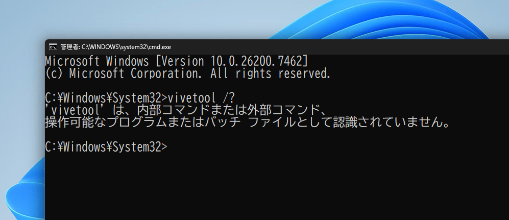 「vivetool /?」を実行して「'vivetool' は、内部コマンドまたは外部コマンド」エラーがでている画像
