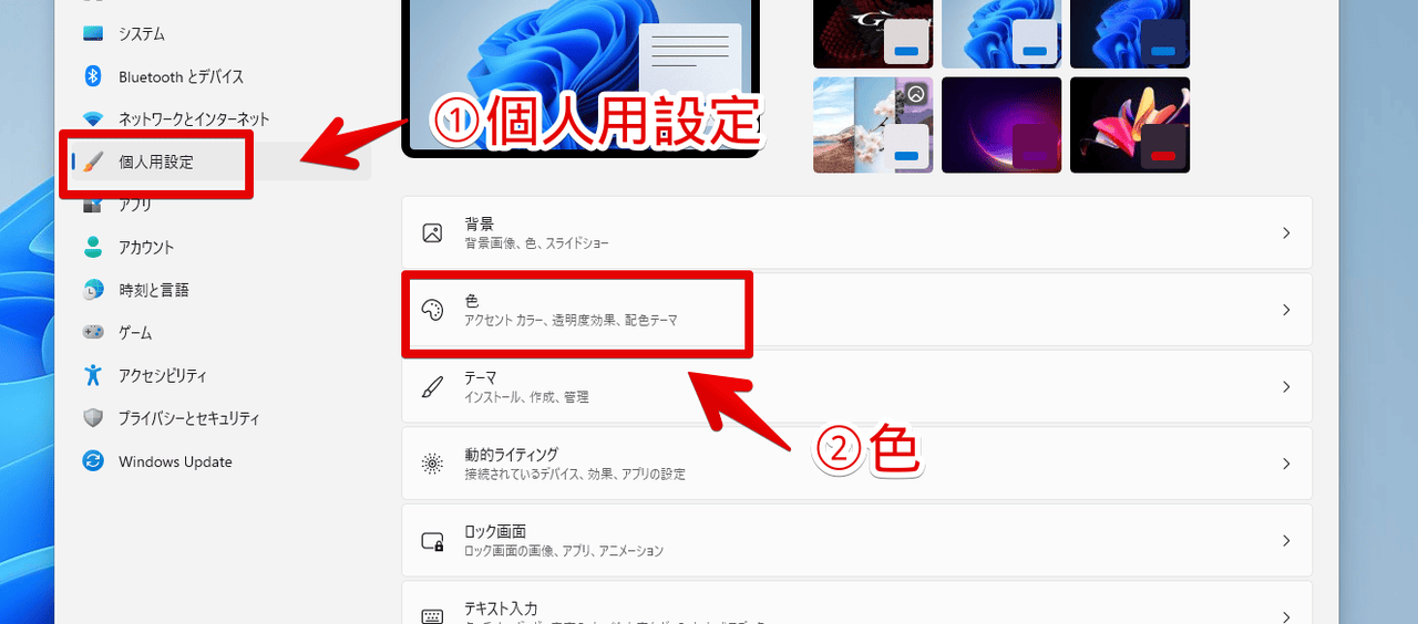 左側サイドバーの「個人用設定」→「色」をクリックします。