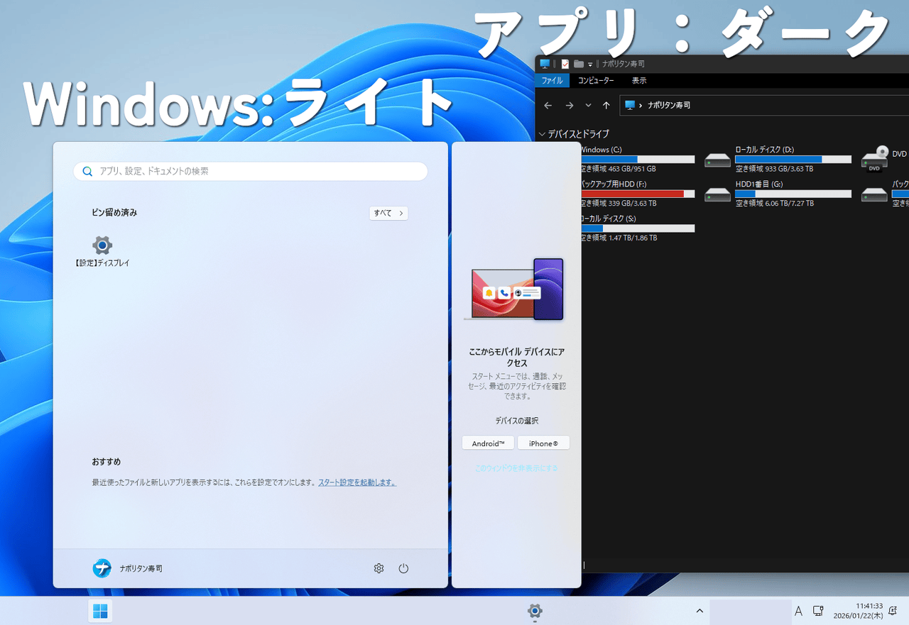Windows11ではスタートメニューや設定は黒にして、エクスプローラーやブラウザなどのアプリは白にするといった使い分けができます。
