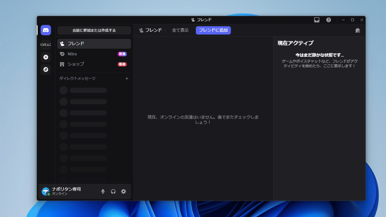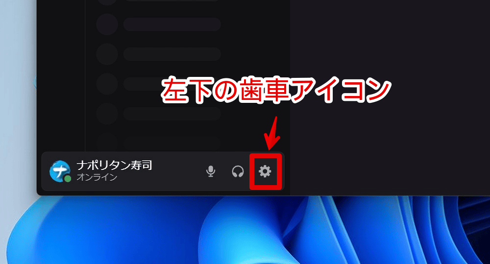 Windows11で「Discord」を起動します。左下のユーザー名横にある歯車ボタン(設定)をクリックします。