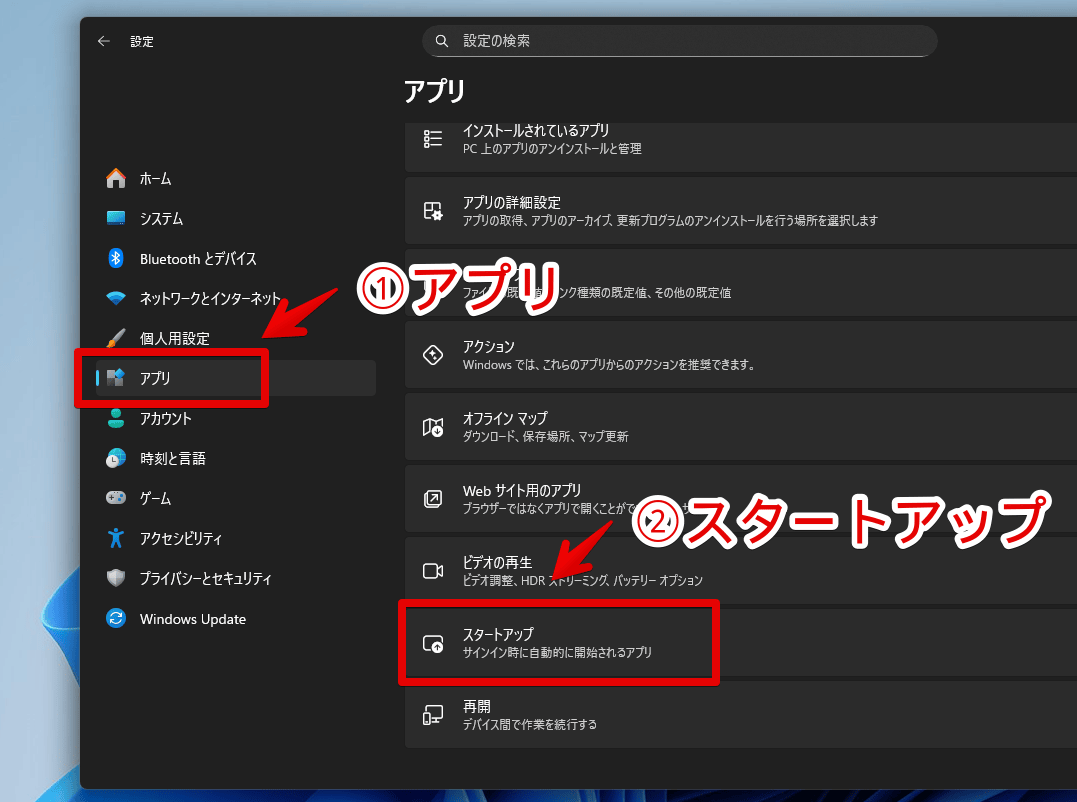 左側の「アプリ」→「スタートアップ」をクリックします。