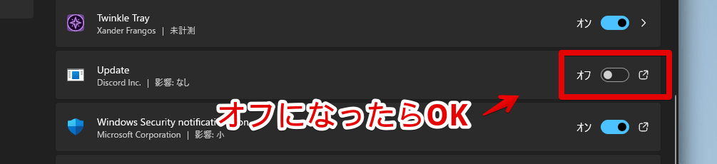 以上、Windows11を起動した時にスタートアップ起動する「Discord」をオフにする方法でした。