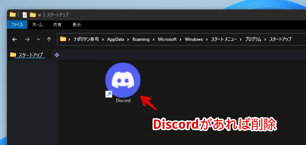 もし中に「Discord.lnk」みたいなショートカットアイコンがあれば削除します。