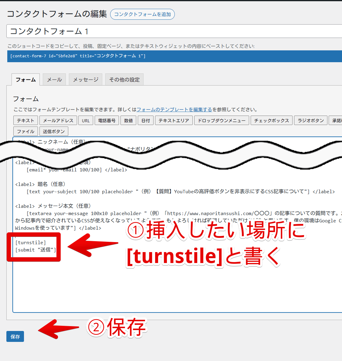 ![「Contact Form 7」に「[turnstile]」ショートコードを書き込んだ画像](https://www.naporitansushi.com/wp-content/uploads/2025/02/wordpress-simple-cloudflare-turnstile-inquiry-form-location_08.png)