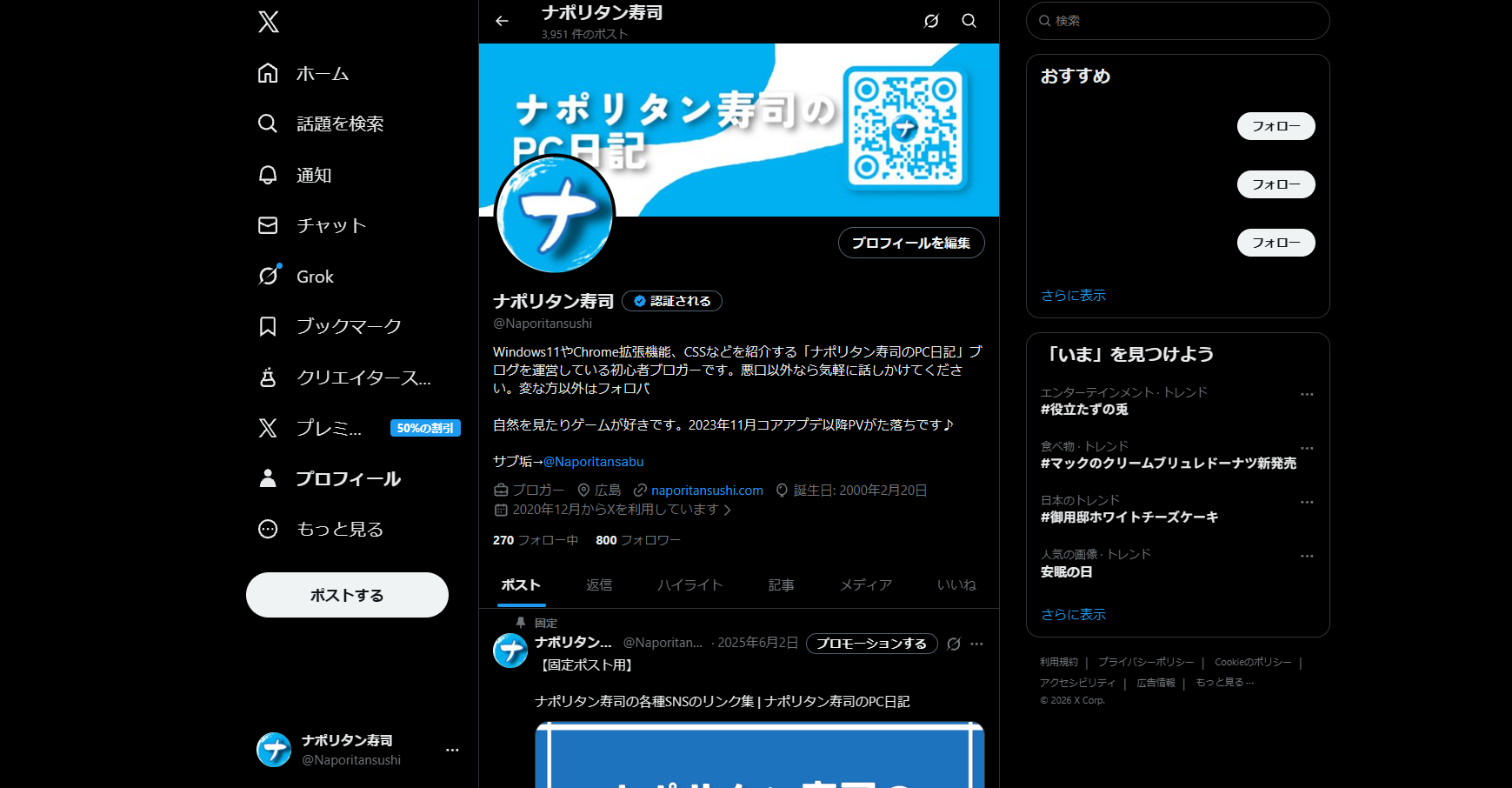 拡張機能導入後、「X(旧Twitter)」を開きます。既に開いていた場合は一度ページをリロードします。自動的に以前のダークブルー背景になります。