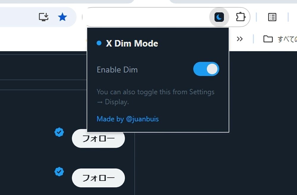 拡張機能アイコンをクリックするとポップアップが表示されます。「Enable Dim」でオンオフできます。