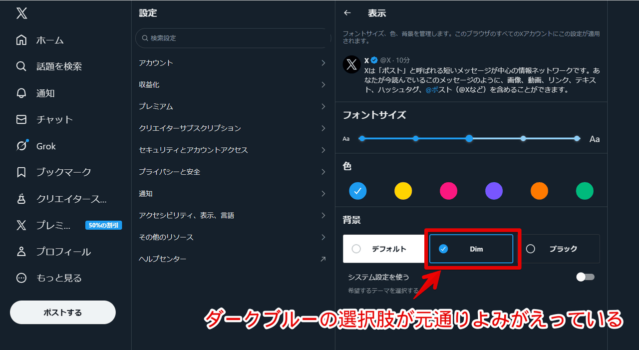 Xのダークブルー設定項目は英語だと「Dim」らしいです。