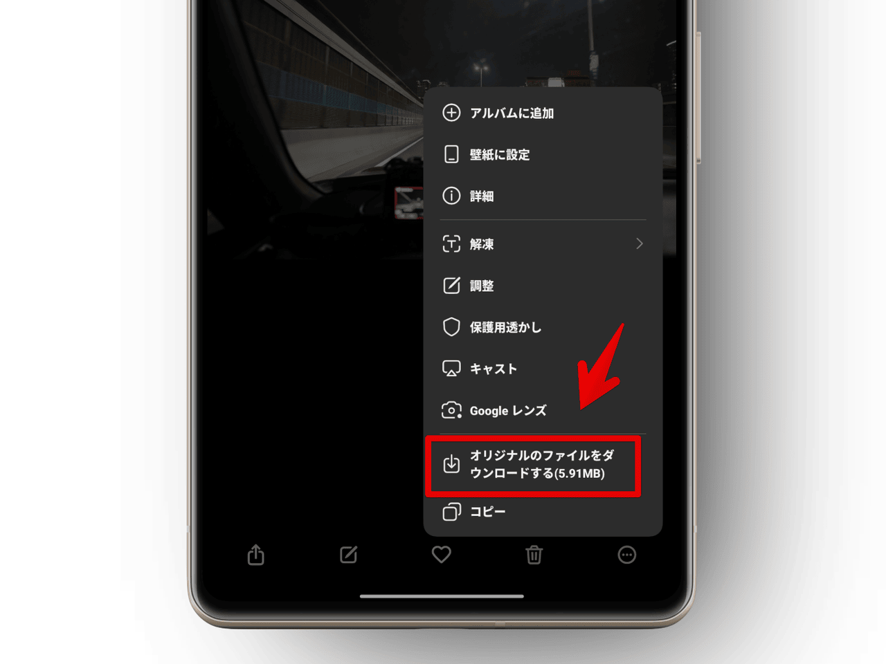 右下にある三点ボタン(…)→「オリジナルのファイルをダウンロードする」をタップして保存します。