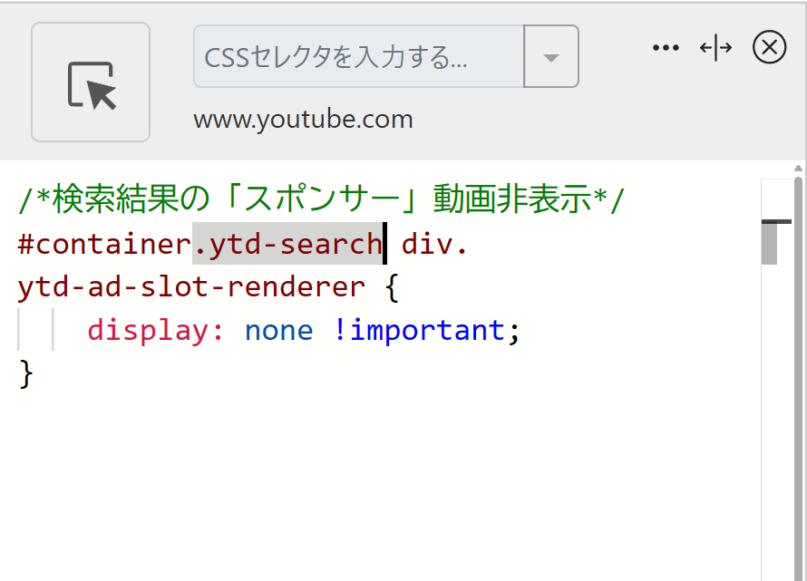 以上、PCウェブサイト版「YouTube」の検索結果に表示される「スポンサー」動画を非表示にするCSSでした。