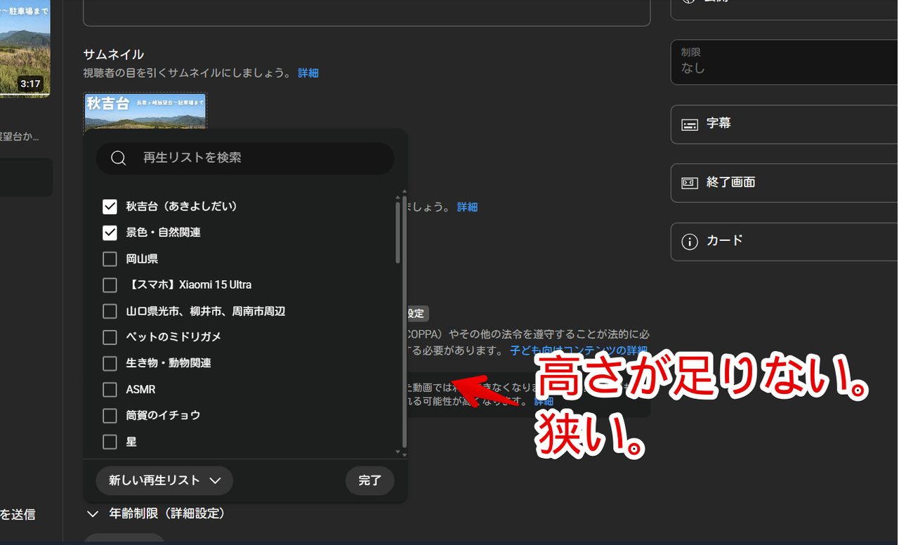 動画をアップロードした時の再生リスト選択画面が少し小さいと感じました。