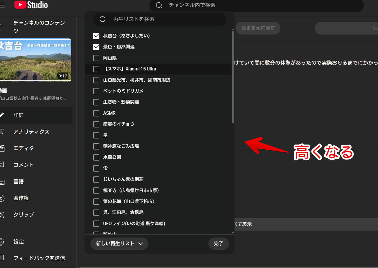【YouTube Studio】再生リスト選択画面の高さを広げるCSS